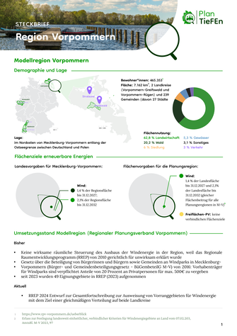 Das Factsheet dokumentiert den Umsetzungsstand in der Modellregion Vorpommern des Projekts PlanTieFEn. Es beschreibt die aktuelle räumliche Steuerung für Windenergie und analysiert Potenziale für Wind‑ und Photovoltaikanlagen (inkl. Agri‑PV). Ziel ist, die Planung erneuerbarer Energien mit regionalen sozio‑kulturellen und landschaftlichen Besonderheiten abzustimmen und damit eine tragfähige Energiewende vor Ort zu ermöglichen.