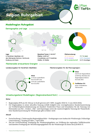 Das Factsheet stellt die Modellregion Ruhrgebiet des Projekts PlanTieFEn vor. Es enthält demografische und flächenspezifische Daten sowie Potenzialanalysen für Wind‑ und Photovoltaik‑Projekte. Ziel ist es, Energiewende‑Planungen regional differenziert, raumsensibel und partizipativ zu gestalten — unter Berücksichtigung technischer, rechtlicher und sozio‑kultureller Parameter.